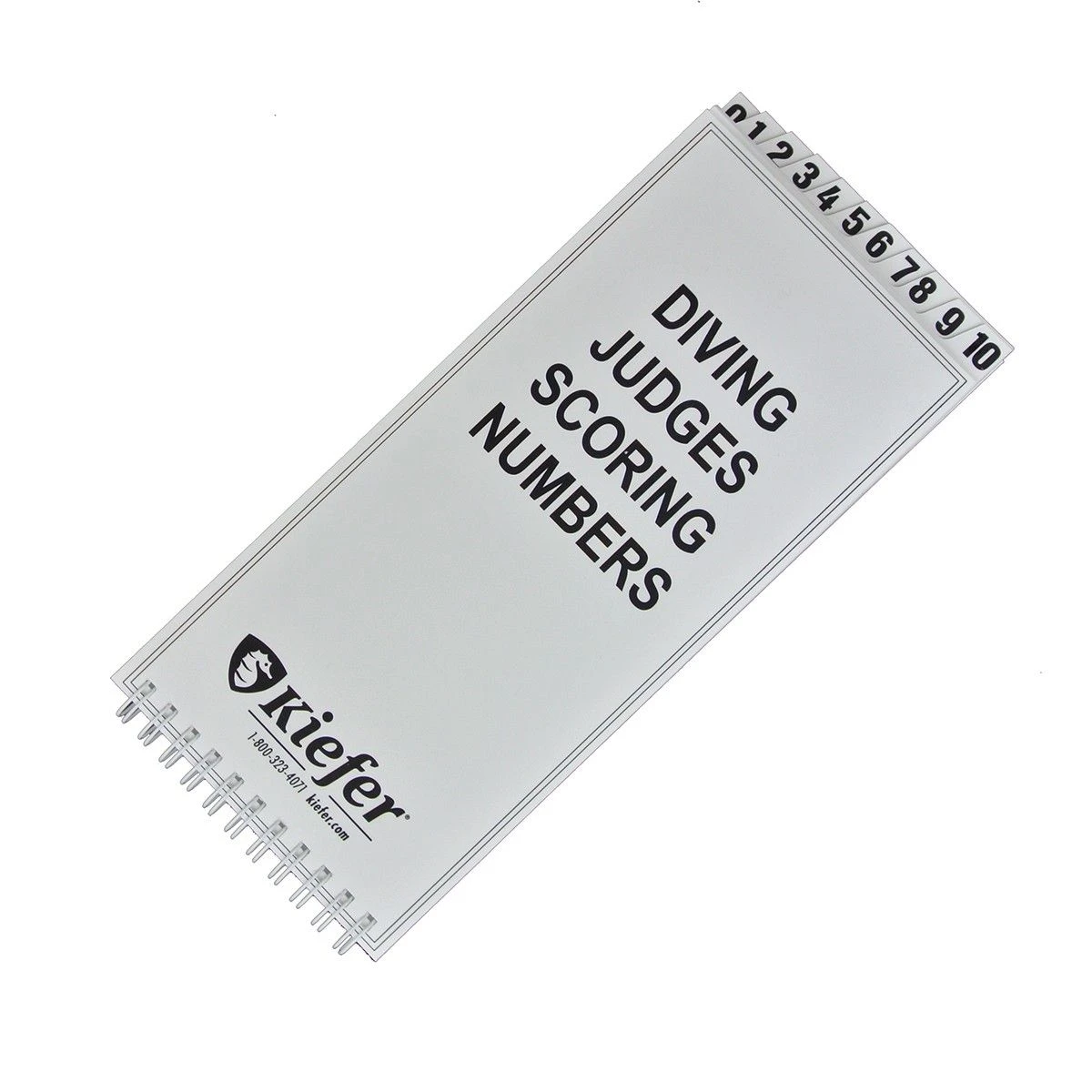 Kiefer diving score cards are durable, made from sturdy 9″ x 4″ plastic sheeting bound by coated metal wire. Pages are tabbed by point, allowing scores of 0 through 10 in 1/2 point increments and feature highly visible 6 3/4″ high numbers.