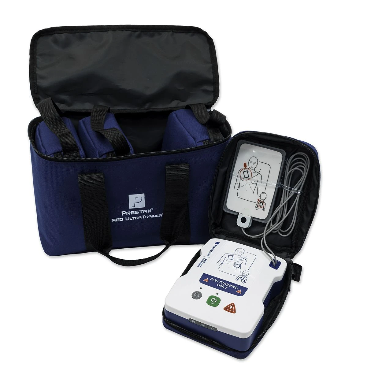 PRESTAN AED UltraTrainerโข 4-Pack with English/Spanish Languages, 12 โCโ batteries (not included), 4 sets of Adult/Child Training Pads with unique Pad Sensing System , 4 pad storage trays, instructions, 4 unit carry bags and 1 master carry bag